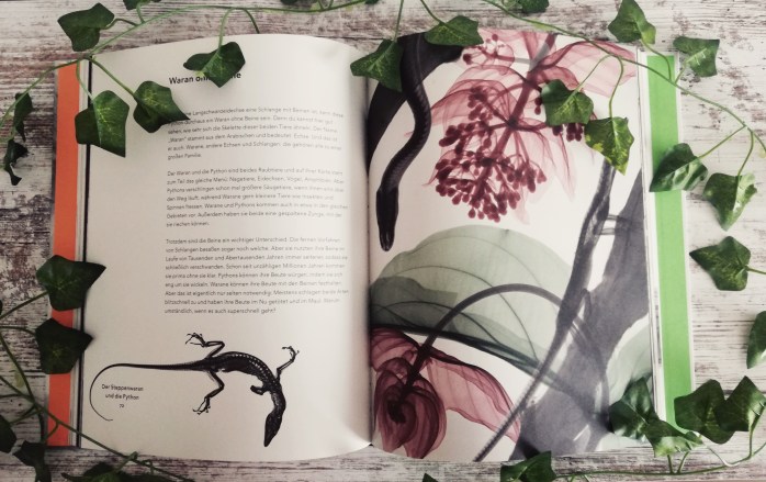 Die ästhetischen Bilder, die uns dieses Buch zeigt, wurden nicht am Computer zusammengestückelt, nein, die Kompositionen aus zarten Pflanzen und starken Tierknochen oder Gräten entstanden dank des einfallsreichen Einsatzes verschiedener Strahlungsstärken in direkter Verbindung miteinander. Die Texte, die Schutten beisteuert, richten sich im Tonfall durchaus eher an ein jüngeres Publikum, aber auch Erwachsene können hier noch so einiges lernen, ohne dabei in wissenschaftlichem Geschwätz unterzugehen. So erklärt er uns verständlich, wofür manche seltsame Knochenbildung gut ist, welcher Knochen ein Überbleibsel aus Urzeiten ist, und noch so einiges mehr.