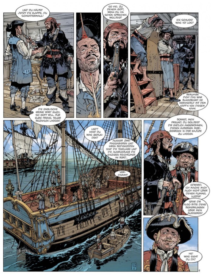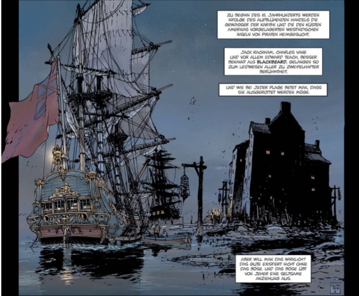 Die Zeichnungen sind genauso rau wie die See, die sie wiedergeben. Die Männer (und es sind natürlich fast nur Männer auf den Schiffen zu sehen) haben wind- und wettergegerbte Gesichter, rissige Kleidung, ein loses Mundwerk – kurzum, wir können uns in der gezeigten Atmosphäre schnell fallen lassen. Dabei wechselt das Geschehen beständig zwischen Blackbeard und Port Royal auf Jamaika. Hier befindet sich jemand, der im Laufe der Geschichte eine offene Rechnung mit Blackbeard begleichen möchte und dafür den berühmt-berüchtigten Benjamin Hornigold anheuert. Ob das wohl gut geht? Immerhin verbindet Hornigold und Blackbeart eine gemeinsame Vergangenheit.