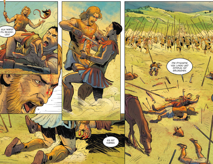 An dieser Reihe von Ferry und Bruneau finde ich absolut faszinierend, dass sie bei jedem neuen Band mit anderen Künstlern zusammen arbeiten, und doch die Qualität und die Optik immer ineinandergreift, blättert man nun in Antigone oder Herakles. Auch hier findet sich am Ende des Buches ein Anhang, der sich tiefergehend mit der Tragik des Geschehens rund um die willensstarke Antigone beschäftigt.
