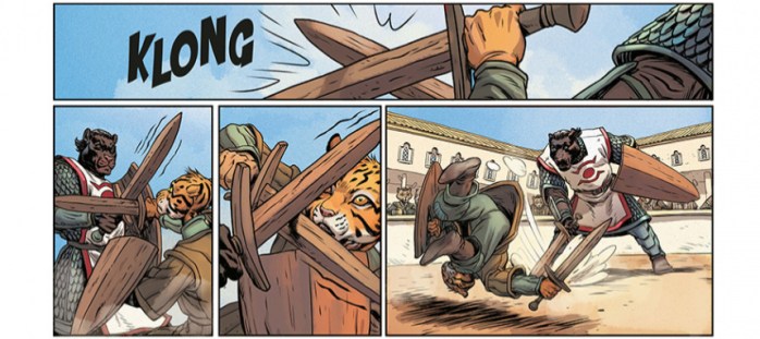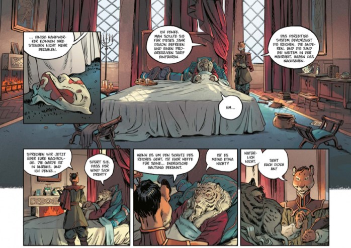 Die ersten beiden Bände schneiden zwar hier und da durchaus auch die anderen vier Reiche der Welt an – wir dürfen zum Beispiel einen kleinen Blick in die Welt der Bären werfen – aber aktuell verweilen wir noch in Angleon, dem Reich der Raubkatzen. Ob Tiger, Löwe oder Luchs, die Bewohner sind allesamt Großkatzen. Und genau so verhalten sie sich zum Teil auch, denn die Krallen werden des Öfteren ausgefahren. Neben den Intrigen bei Hof lernen wir außerdem noch This kennen, einen jungen Ozelot (zumindest ist das meine Interpretation), der bei der königlichen Garde anheuern will. Auch er trägt offenkundig ein Geheimnis mit sich herum, will nicht, dass man in seiner Vergangenheit herumstochert und wird im Verlauf der Geschichte, besonders im zweiten Band einen wüsten Moment erleben.