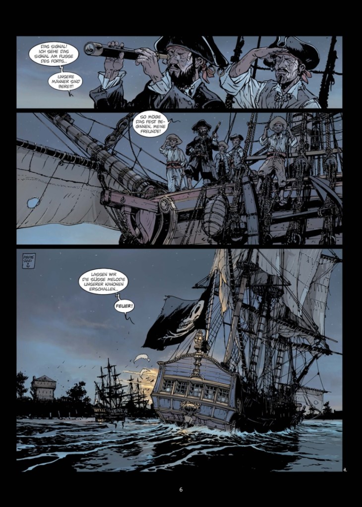Insgesamt war mir der zweite Teil ein wenig zu geradlinig, nachdem sich die Handlung in Band 1 auf zwei Seiten aufgebaut hatte. Aber Jean-Yves Delitte versteht es auf jeden Fall die knappe Seitenanzahl mit Spannung zu füllen und dank seiner großartigen Schiffszeichnungen ein wahres Freibeutergefühl aufkommen zu lassen.