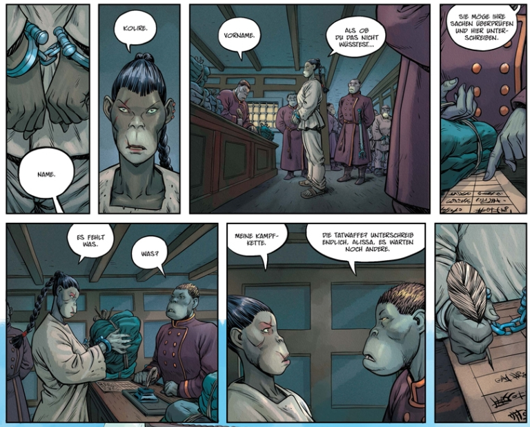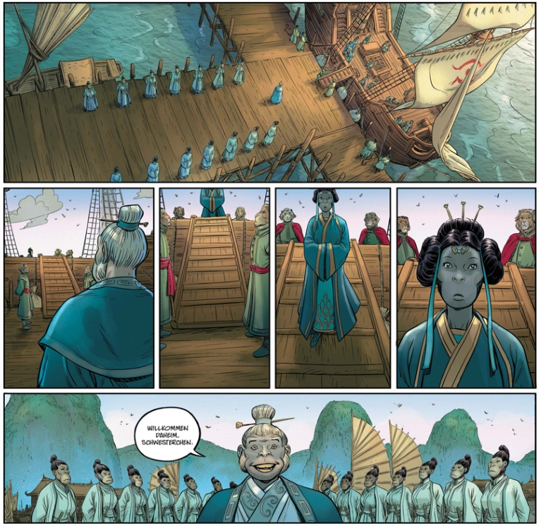 Es sind viele Handlungsstränge, die da auf uns Leser zunächst niederprasseln. Die Rückkehr der Prinzessin, die Freilassung von Alissandra, die gefürchtete Kriegerin eines großen Clans, und dann haben wir da auch noch ein paar Archäologiestudenten, die eine alte Ruine suchen wollen. Viele neue Informationen, die man verarbeiten darf, und die auf gewohnt brilliante Weise zeichnerisch dargestellt werden. Lys glänzt mit seiner herrlichen Architektur, den befahrbaren Flusswegen, dem Königspalast und dem wilden Dschungel, den das Land umgibt. Hat man sich einmal zurecht gefunden, verspricht dieser Auftakt großartige neue Abenteuer, Intrigen, Gewaltausbrüche und Platz für die vielen Gefühle dazwischen.