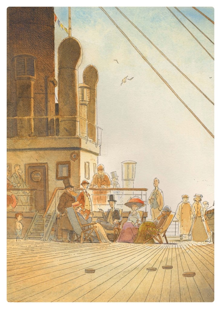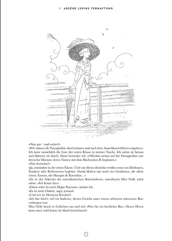 Der Stil Maurice Leblancs ist dabei unglaublich herrlich, charmant, gewitzt, im Plauderton und von Lupins Biographen an uns weitergereicht, erfahren wir von all den schändlichen – und dabei doch so unterhaltsamen! – Missetaten des Gauners, der immer wieder in neuer Verkleidung auf seine bestens vorbereiteten Diebestouren geht. Gewürzt wird das Ganze nun mit den zarten, in Pastelltönen gehaltenen Zeichnungen von Vincent Malliè, die mal großflächlich und mal als kleine Untermalungen immer wieder auftauchen. Von anderen bereits erwähnt, vielen auch mir einige Stellen im Text auf, wo Worte oder halbe Sätze fehlten, bin mir aber sicher, dass der Verlag dieses kleine Manko in der nächsten Auflge bereits berichtigt haben wird.