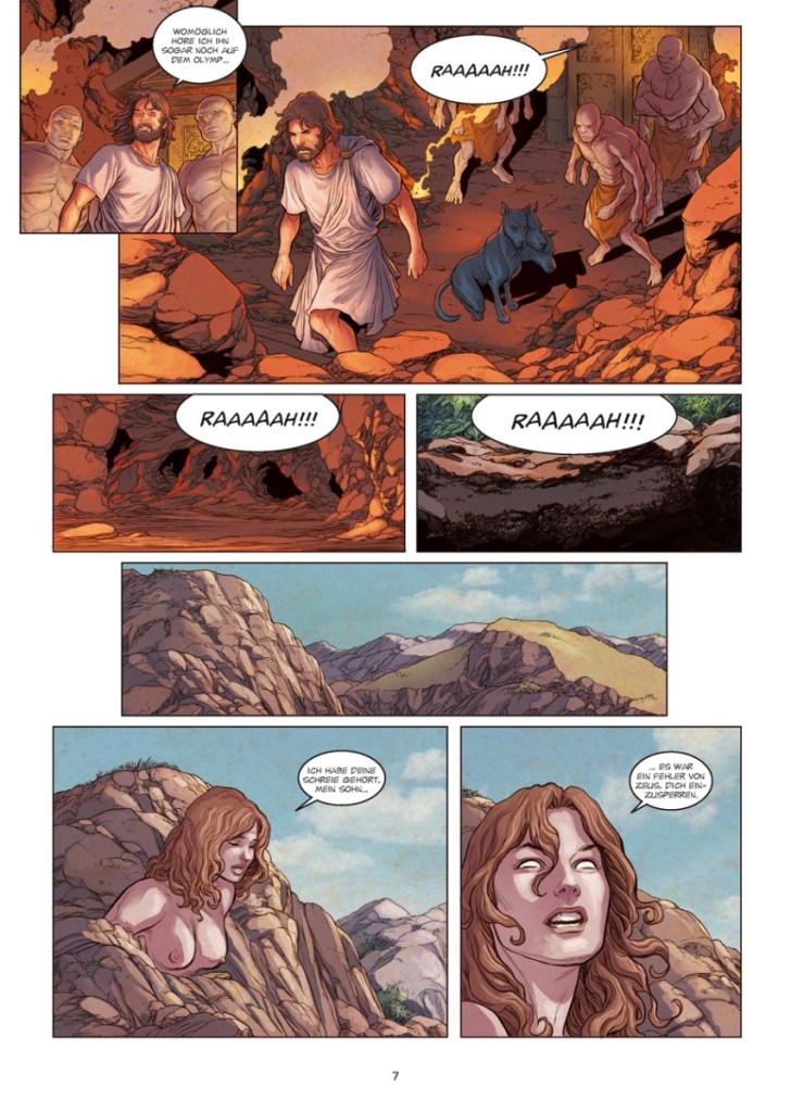 Nachdem Zeus die besiegten Titanen unter der Erde eingekerkert hat, kommen die Giganten hervor, um Rache zu üben. Sie reißen Berge nieder, um an den Olymp zu gelangen. Und um diesen Kampf dreht sich der Großteil dieses Bandes. Es fühlt sich ein wenig wie ein Zwischenband an, denn … Nach dem Kampf ist vor dem Kampf. Am Ende treffen wir nämlich auch noch auf Typhon, den gefürchtetsten aller Söhne Gaias. Doch diesen Kampf erleben wir wohl detaillierter in einem Folgeband, der noch erscheint.