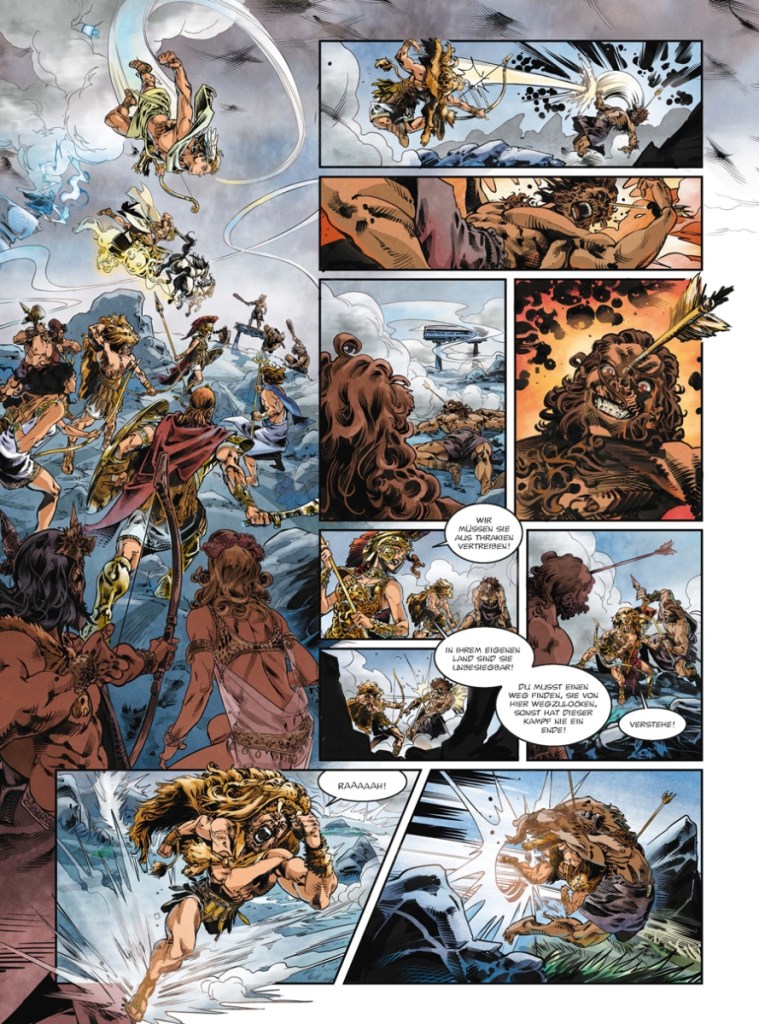 In diesem Band stürzen wir uns ins actionreiche Kampfgetümmel. Bevor es jedoch zum titelgebenden Typhon geht, schlachten wir zunächst einmal mit Herakles ausgiebig die Giganten. Erst danach erleben wir den Kampf zwischen Typhon und Zeus, und mit welcher List und Tücke Typhon am Ende beizukommen ist. Was bleibt, ist die Einsicht, dass wieder die Menschheit die Nachwehen dieses Kampfes ertragen muss. Das Ganze wird uns von Federico Santagati bildgewaltig zusammengefasst, und wem hier und da vielleicht ein paar Erklärungen fehlen, dem hilft wie immer das ausführliche Nachwort von Luc Ferry beim tieferen Verständnis dieses Mythos.
